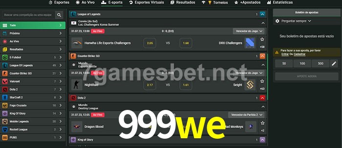 O 999we oferece uma grande seleção de opções de apostas em e-sports com probabilidades competitivas